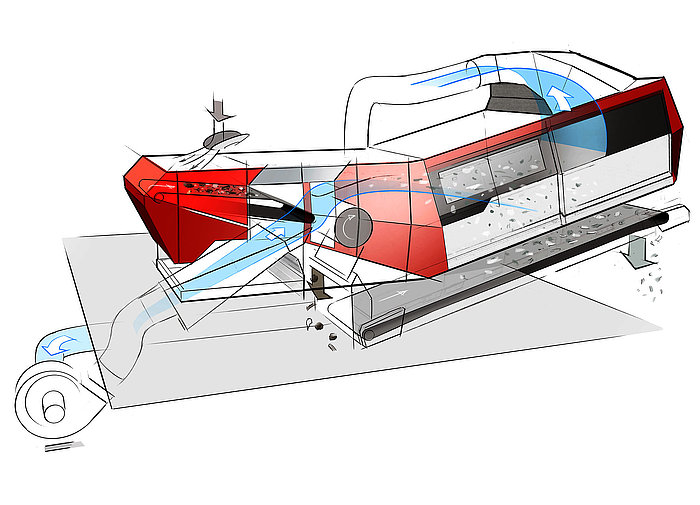 A large number of possible extensions make the AirStar evolution a stationary cross-flow air classifier for all applications. Thanks to the established DiscSpreader material distribution system, narrow, irregular material feeds can be distributed across the entire belt width without the need for additional installation space. To create a third fraction, the new air separator can be equipped with the DuoDrum system, which uses two separating rollers arranged one behind the other. Alternatively, the AirLift overband extraction system, which has also been optimized, can be integrated into the lightweight material chamber to remove ultra-light materials.
