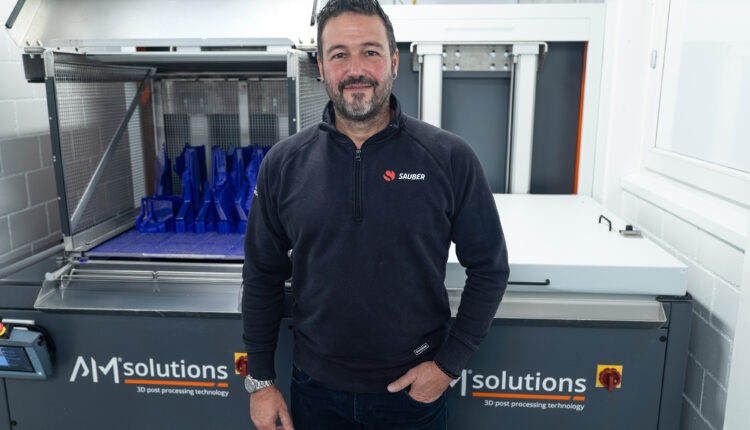 The parts that Sauber Motorsport produces with SLA printing are highly complex and require maximum precision. This is evident from their application, as they are almost exclusively used in the wind tunnel for Formula 1 and are crucial for a vehicle’s aerodynamics. To consistently and quickly deliver high-quality 3D printed parts – approximately 1,000 parts per week between October and February – efficient post- processing is essential. “In the past, we had to manually perform many steps in the chemical post processing of SLA parts,”explains Vitor Sousa, Head of AM Plastic & CNC for AM at Sauber Motorsport.”This not only took a lot of time, especially with seven printers, but it was also a significant strain on the staff working with the solvents. Since February, we have been using two C1 Max machines from AM Solutions and are extremely satisfied.”